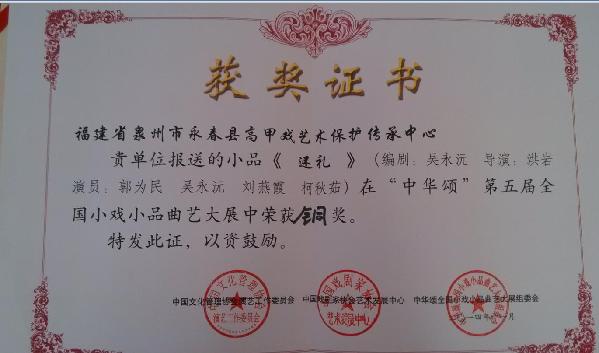 永春县编排选送的廉政教育宣传小品《还礼》在“中华颂”第五届全国小戏小品曲艺大展上荣获铜奖。