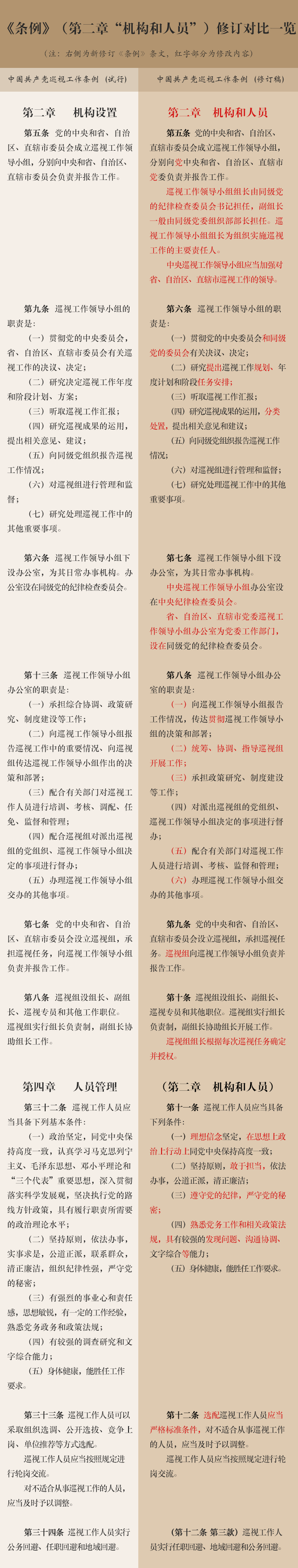 《中国共产党巡视工作条例》改进巡视工作领导体制,明确“中央巡视工作领导小组应当加强对省、自治区、直辖市巡视工作的领导”。将中央巡视工作领导小组对省区市巡视工作由“指导”变为“领导”,一字之变,却是巡视领导体制和工作机制的重大创新。