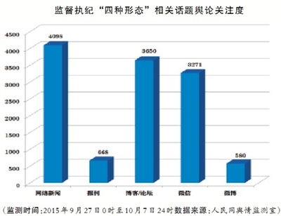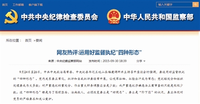 监督执纪的“四种形态”引发媒体、专家学者以及网民的热烈讨论。舆论解读认为,“四种形态”掷地有声地指明了当前反腐败工作的方向,既不是现在就要在数量层面放缓反腐节奏,更非一些人所担心的“将来只怕要成为一些问题官员被轻处理的借口”,而是把“全面从严治党,要管全党、治全党”突出出来,“全面”就是全方位、全覆盖,每一名党员、每一个党组织都在其中、不能例外。