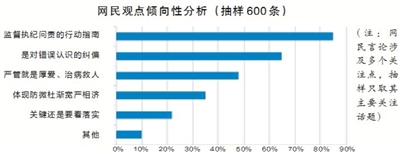 绝大多数网民点赞“四种形态”系统全面地对党员干部在不同程度违纪的问题提出了科学合理的处理原则,让纪检监察机关回归到执纪的主业上来,堪称监督执纪问责的行动指南;大多数网民表示,“四种形态”是对“反腐败等同于全面从严治党”“主业等同于查办案件”等认识误区的纠偏;近五成网民强调要本着严管就是厚爱、治病救人之心来监督执纪;超过三成网民认为“四种形态”具有现实针对性,体现了防微杜渐、宽严相济和教育与惩处并重的干部管理新原则;还有部分网民提醒,“四种形态”更为重要的是如何把握和运用,从而落实到实际工作中去,长说长提长议不如常落实。另外,还有一些网民表达了“四种形态”体现的是中央对治理贪腐的信心、决心和能力,而绝不是对贪腐“零容忍”和“高压态势”的“放松”和“退缩”等其他观点。