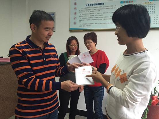 图为11月13日,洛江区纪委干部向万安街道万盛社区党支部书记、社区主任李建辉赠送《准则》《条例》现场。