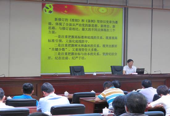 讲座中,市监察局林振约副局长对《准则》和《条例》进行了深入的解读,并充分结合泉州实际情况,通过典型案例进行分析,使得两项法规更加通俗易懂,真正使党的纪律在全体人员中入脑入心。图为泉州市纪委监察局举办《准则》和《条例》专题辅导讲座现场