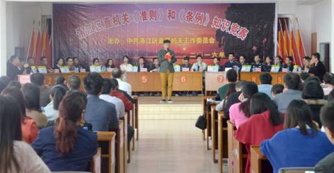 日前,洛江区举办主题为“坚持‘高线’,永葆政治本色;坚守‘底线’,争做遵纪模范”的《准则》《条例》知识竞赛活动。此次竞赛由区纪委牵头,区直机关党工委主办,竞赛内容包括《准则》、《条例》原文,省纪委监察厅网站“领导干部任职前廉政法规知识测试”题库等。共有10支队伍参加,每支队伍至少有1名科级干部。通过竞赛,在全区党员干部中掀起学习党章党规的热潮,促使广大党员干部遵守党规党纪。图为:洛江区《准则》《条例》知识竞赛现场