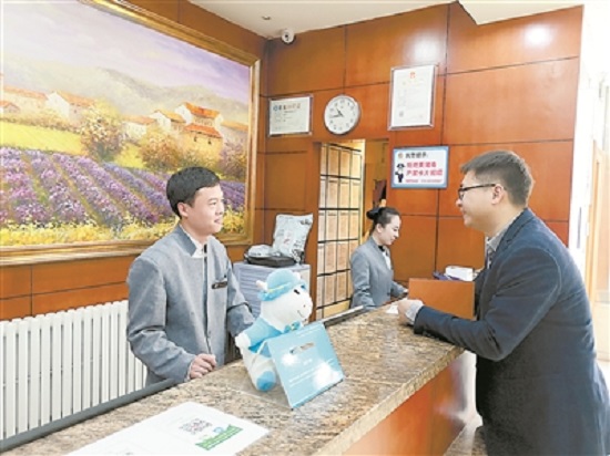北京市西城区某快捷酒店的前台接待曹健涛(左一)表示,他所在的快捷酒店成为越来越多来京出差干部的入住选择,明显感觉许多干部的节约意识增强了,会盘算着帮公家省钱了。