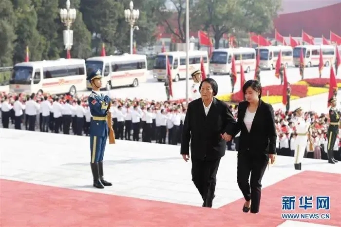 2019年9月29日上午,“共和国勋章”获得者申纪兰抵达人民大会堂。新华社记者 刘彬 摄