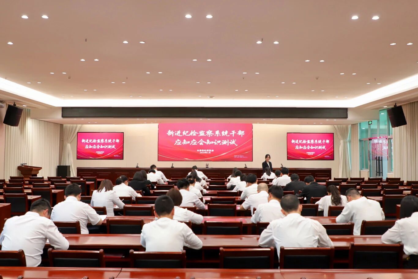 永春县纪委监委建立以考促学、以赛促能的检验机制,围绕党纪法规与工作实务,定期组织专题测试,引导纪检监察干部切实提高运用法治思维和法治方式的能力。图为该县纪委监委组织新进干部开展纪法知识测试。(陈跃虹 摄)