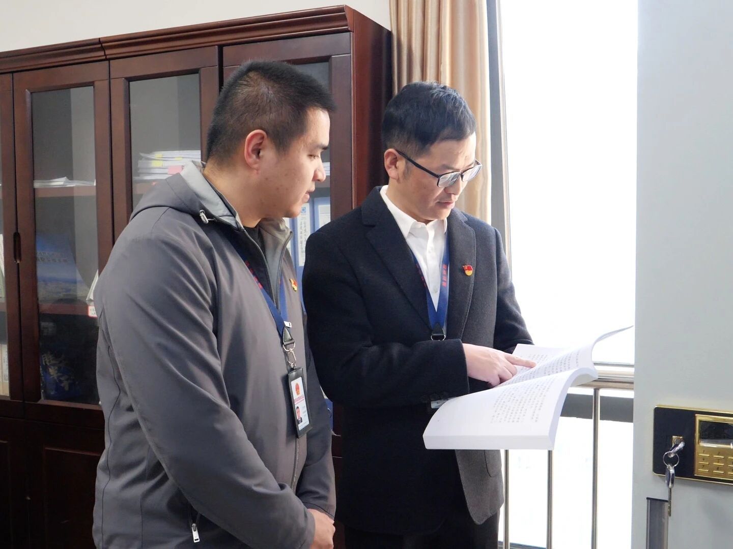 图为庄培灿(右一)作为业务导师对科室内新进年轻干部开展“师徒帮带”