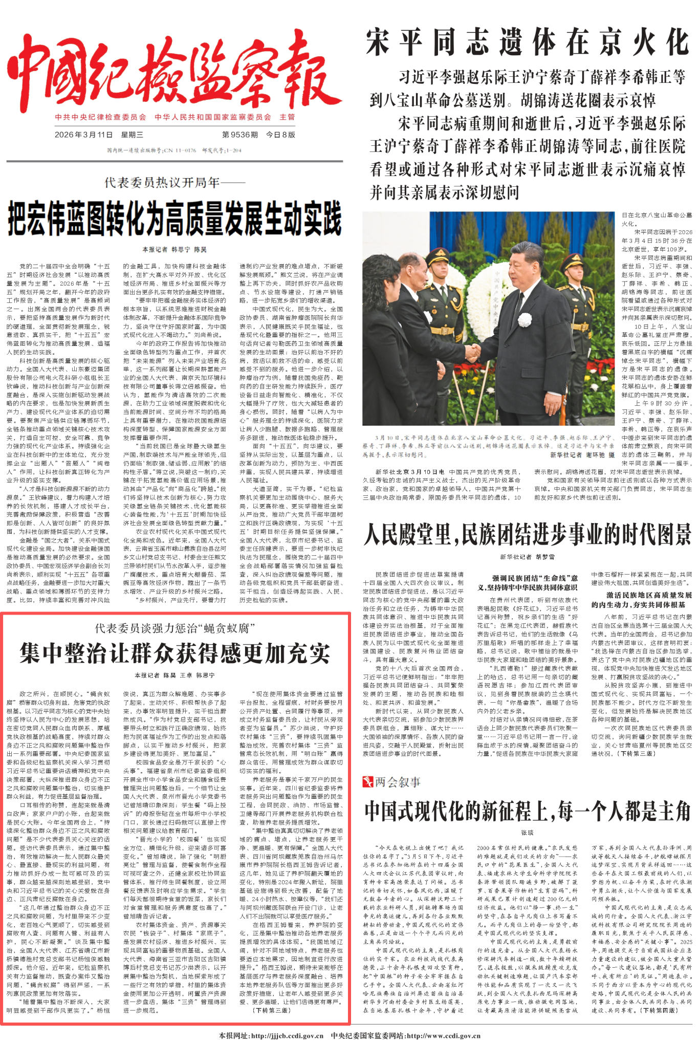 今年是“十五五”开局之年,也是群众身边不正之风和腐败问题集中整治攻坚决战之年。出席全国两会的省区市纪委书记、监委主任表示,纪检监察机关要立足职能职责,继续锚定目标、强力推进,一鼓作气、善作善成,带着对人民群众深厚感情,严惩“蝇贪蚁腐”,纠治顽瘴痼疾,力争取得行风重塑、基层善治、群众受益的综合性成果,让群众真切感受到正风反腐加力度、清风正气在身边。(本报记者 陈昊 王卓 韩思宁)